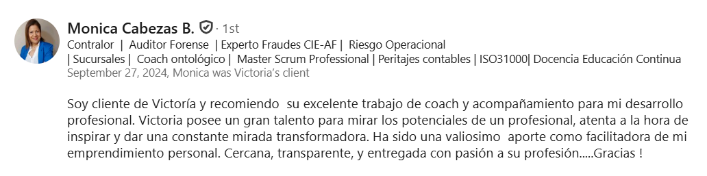 Mi nombre es Vicky, Soy Coach y Psicóloga organizacional. Enseño a las personas a encontrar trabajo en Irlanda y en Chile. Te enseño estrategias efectivas de búsqueda, diseño CV, Mejoras en tu LinkedIN, entre otros. Asesoría a medida, acorde a tus objetivos profesionales.